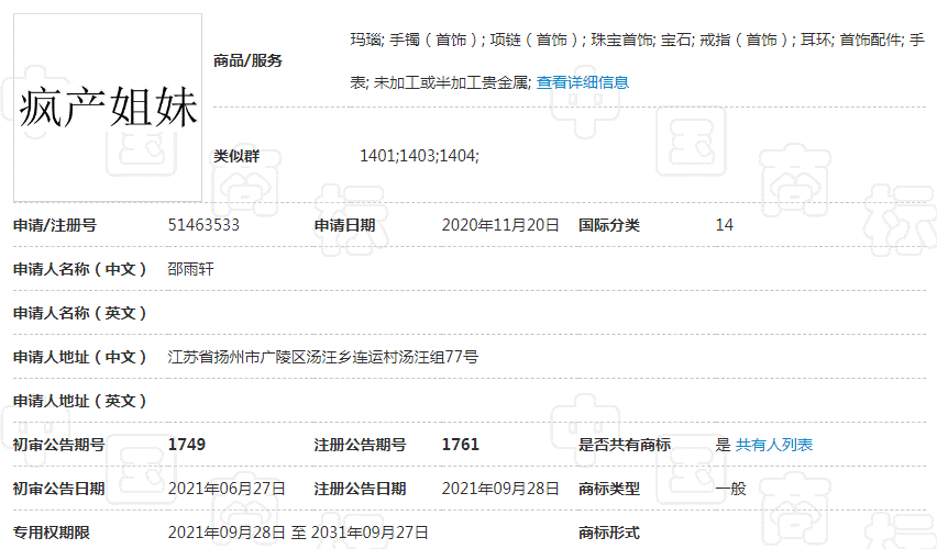 可见该账号在运营过程中还没有能够采用公司化的管理和运营方式,而且在检索时还发现,“疯产姐妹”的商标则绝大部分由邵雨轩以个人名义进行了注册,不过共有人都是张佳丽,如果张佳丽就是张小花,也就是说虽然账号分了家,但是“疯产姐妹”的商标仍然共有。