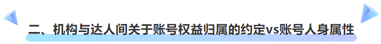【结语】实名认证人并不必然就是账号权益的归属方,无论是机构还是达人,在就账号孵化、运营签署相关合同的时候,不能仅仅着眼于合作期间的权益,对于合作结束后相关事宜的清理(账号权益归属、肖像权使用、物料清理/下架、结算等)同样不能忽视,此外,更要重视平台规则的每次变化对自身权益造成的影响。